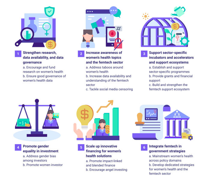 The report outlines six strategic recommendations: strengthening research and data governance, increasing awareness of women’s health topics, supporting sector-specific accelerators, promoting gender equality in investment, scaling up innovative financing, and integrating femtech into government strategies.